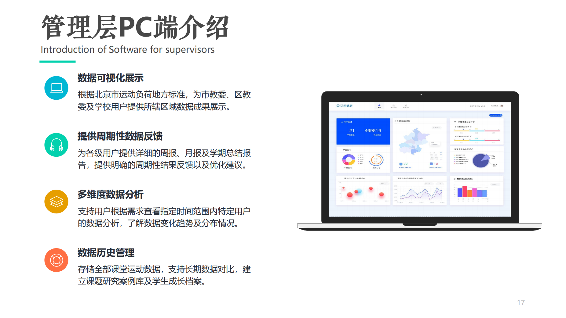 体育课运动数据系统采用教育场景专用架构设计,整合可穿戴传感设备、环境采集终端、定位基站与云端分析平台,通过无线传输网络实现课堂数据的实时汇聚与处理。系统具备多终端协同能力,可同时采集整个班级的学生运动数据,支持户外与室内不同教学环境的应用需求。体育课运动数据系统的核心技术价值在于将复杂的体育运动过程转化为可量化、可分析、可评估的教育数据:通过智能算法实时计算运动强度指数、有效运动时间、能量消耗水平、技能完成质量等关键指标,并记录运动轨迹、参与度、互动频率等行为数据。系统采用教育友好型设计,设备轻便安全,操作简洁直观,适合中小学教育场景的规模化应用。